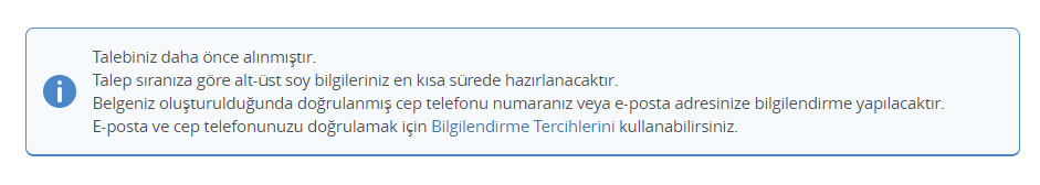 "Talebiniz alınmıştır. Talep sıranıza göre alt üst soy bigileriniz en kısa sürede hazırlanacaktır. Belgeniz oluşturulduğunda doğuralanmış cep telefonu numaranız veya e posta adresinize bilgilendirme yapılacaktır. E poste ve cep telefonunuzu doğrulamak için bilgilendirme tercihlerini kullanabilirsiniz.