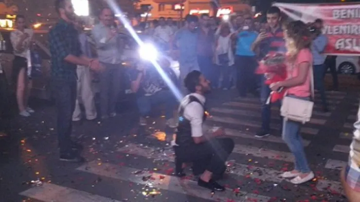 Kürşat Esendemir (25) isimli genç Alparslan mahallesinde bulunan bir alışveriş merkezinde çalışan kız arkadaşı Aslıhan Kip’e (25) evlenme teklif etmek için sürpriz bir program hazırladı. Genç kızın işten çıkış saatini bekleyen genç ve arkadaşları konfeti ve havai fişeklerle hazırlıklarını tamamladı. Genç kızın kapıdan çıkmasıyla birlikte kalabalık konfetileri patlatırken ‘Benimle Evlenir Misin Aslım’ yazılı pankartı açtı. Gördükleriyle şok olan Aslıhan Kip’in önünde diz çöken Esendemir, evlilik teklifi yaptı. Kip’in ‘Evet’ cevabını vermesiyle çevredeki kalabalık da alkışlarla çiftin mutluluklarına ortak oldu.