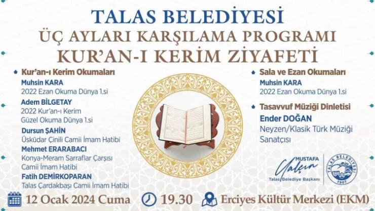 Üç ayların başlamasıyla birlikte hissedilen manevi atmosfere katkı sağlamak amacıyla hazırlanan programda, geçtiğimiz yıl olduğu gibi bu yıl da ülkemizin önde gelen hafızları Kur’an-ı Kerim tilavetinde bulunacak. 2022 Ezan Okuma Dünya Birincisi Muhsin Kara, 2022 Kur’an-ı Kerim Güzel Okuma Dünya Birincisi Adem Bilgetay, Üsküdar Çinili Camii İmam Hatibi Dursun Şahin, Konya Meram Sarraflar Camii İmam Hatibi Mehmet Erarabacı ve Talas Çardakbaşı Camii İmam Hatibi Fatih Demirkoparan’ın sesleriyle büyüleyeceği programda Ender Doğan da ilahileriyle davetlilere hoş bir gece yaşatacak. Talas Girişi SGK yanındaki Erciyes Kültür Merkezi’nde 12 Ocak 2024 Cuma günü düzenlenecek olan program saat 19.30’da başlayacak ve her zaman olduğu gibi ücretsiz olarak izlenebilecek.