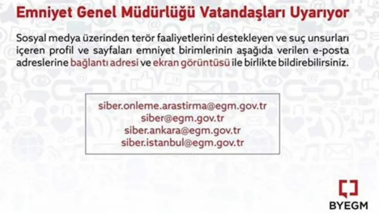 İnternet kullanıcılarına düşen görev; sanal alemde dolaşırken dikkatli olmak ve vatandaşlık görevini yerine getirmeye çalışmak ve tehlikeli paylaşımlar yapan kişileri Emniyet Müdürlüklerinde açılan ihbar mail hattına şikayet etmek… Emniyet yetkilileri böyle durumlar karşısında, bağlantı adresi ve ekran görüntüsüyle birlikte emniyet birimlerinin oluşturduğu "[email protected]", "[email protected]" adreslerine bilgi verilebileceğini söylüyor.