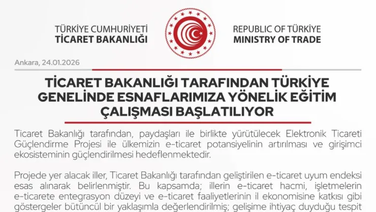 Ticaret Bakanlığı tarafından Türkiye genelinde esnaflara yönelik eğitim çalışması başlatılacak. Bakanlık paydaşları ile birlikte yürütülecek Elektronik Ticareti Güçlendirme Projesi ile e-ticaret potansiyelinin artırılması ve girişimci ekosisteminin güçlendirilmesi hedefleniyor.