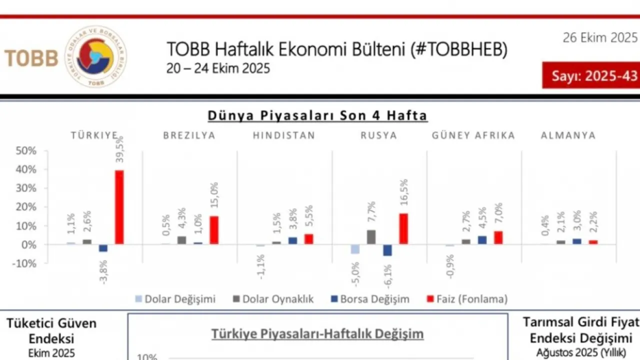 TOBB tarafından haftalık ekonomi bülteni yayınlandı. 20-24 Ekim 2025 tarihini kapsayan rapora göre Eylül ayında 83,9 olan mevsimsellikten arındırılmış Tüketici Güven Endeksi, Ekim 2025'te bir önceki aya göre yüzde 0,3 azalarak 83,6 seviyesinde gerçekleşti. Aynı dönemde hanenin maddi durumu endeksi yüzde 0,1 azaldı, hanenin maddi durum beklentisi endeksi yüzde 0,2 arttı, genel ekonomik durum beklentisi endeksi yüzde 0,7 arttı.