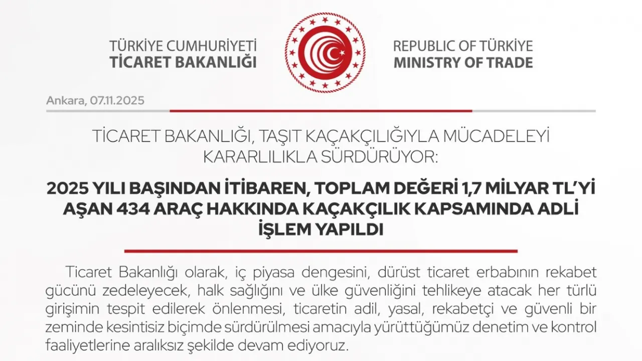 Ticaret Bakanlığı tarafından taşıt kaçakçılığı ile ilgili çalışmalar sürüyor. Bu kapsamda 2025 yılı başından itibaren, toplam değeri 1,7 Milyar lirayı aşan 434 Araç hakkında kaçakçılık kapsamında adli işlem yapıldı.