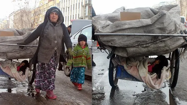 Sabahın erken saatlerinde soğuk havaya aldırış etmeden iki çocuğu ile birlikte kağıt toplamaya çıkan anne, 1.5 yaşındaki kızı Hatice'yi battaniyeye sararak kağıt topladığı el arabasının altındaki sepete koydu. Kamerayı görünce arabayı ve çocuğunu görüntülenmemek için bırakan anne konuşmaktan kaçınırken, 1.5 yaşındaki Hatice'nin annesinin kağıt topladığı süre boyunca battaniyeye sarılı sepette kaldığı öğrenildi.