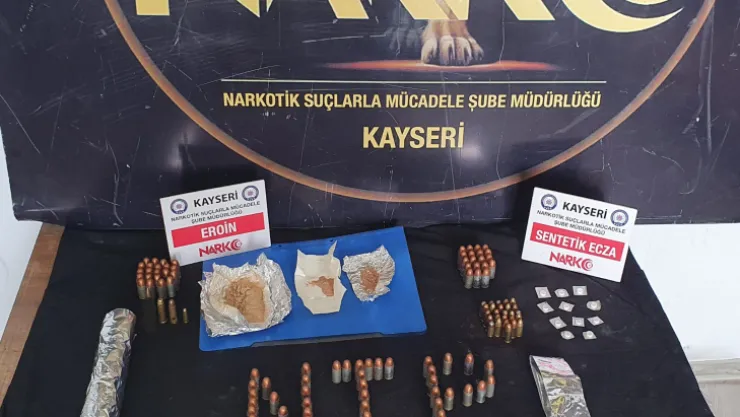 Kayseri İl Emniyet Müdürlüğü Narkotik Suçlarla Mücadele Şube Müdürlüğü ekipleri 'uyuşturucu madde ticareti' yapıldığı bilgisine ulaştı. Bu kapsamda Kocasinan ilçesi Kayabaşı Mahallesinde bulunan bir adrese operasyon düzenlendi. Adrese yapılan aramada 15.50 gram eroin, 11 adet sentetik ecza hap, 115 adet fişek, 1 adet uyuşturucu paketlemek için rulo folyo ele geçirildi.