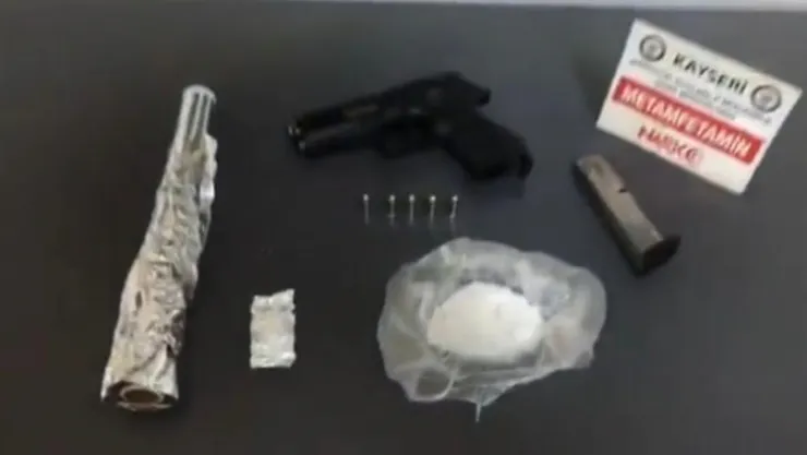 Kayseri'de 19 yıl kesinleşmiş hapis cezası bulunan şüpheli uyuşturucu satıcısına narkotik polis tarafından şok operasyon düzenlendi. Tabanca ve bir miktar uyuşurucu ile yakalanan şüpheli gözaltına alındı.