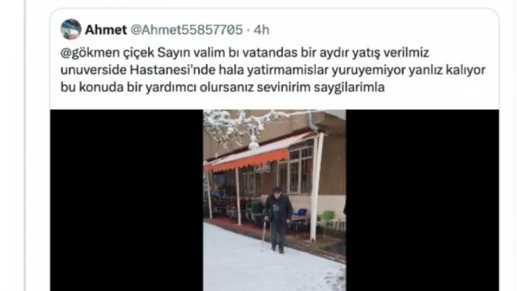 Kayseri Valisi Gökmen Çiçek, yaşlı bir adamın yalnız yaşadığını ve yürümekte güçlük çektiğini bildiren bir vatandaşın sosyal medya paylaşımına 'hemen ilgileniyorum' yanıtını vererek konu hakkında çalışma gerçekleşeceğini belirti.