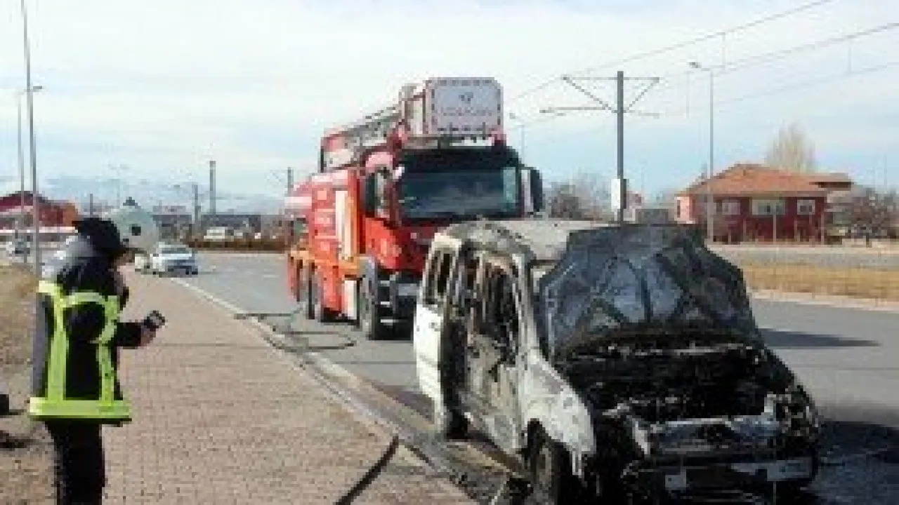 Kayseri'de içerisinde 4 kişinin bulunduğu otomobil, seyir halindeyken yandı. Sürücünün erken fark etmesiyle olayda yaralanan olmazken, otomobil küle döndü.
