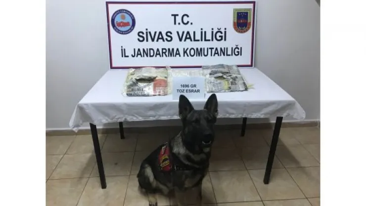 Sivas İl Jandarma Komutanlığı ekiplerince Malatya-Kayseri D-300 karayolu üzerinde yapılan yol kontrol ve arama tarama faaliyetleri sırasında Diyarbakır istikametinden, İstanbul istikametine giden yolcu otobüsünü durdurdu. Otobüste narkotik köpeği 'Geçim' ile birlikte yapılan arama sırasında 'Geçim' otobüste seyahat eden 21 yaşındaki Y.E.T.'ye tepki gösterdi. Jandarma ekipleri şahsın üzerinde yaptığı aramada 1 kilo 696 gram toz esrar ele geçirdi. Olay sonrası şahıs gözaltına alınarak karakola götürüldü.