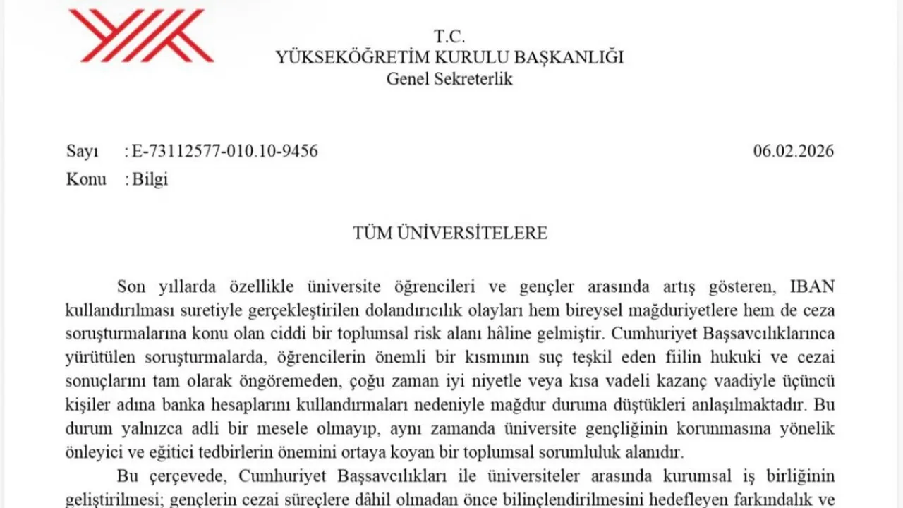 Yükseköğretim Kurulu Başkanlığı, tüm üniversitelere ortak bildiri yayımladı. Yayımlanan bildiride, 'IBAN kullandırılması suretiyle gerçekleştirilen dolandırıcılık olayları hem bireysel mağduriyetlere hem de ceza soruşturmalarına konu olan ciddi bir toplumsal risk alanı haline gelmiştir. Bu durum yalnızca adli bir mesele olmayıp, aynı zamanda üniversite gençliğinin korunmasına yönelik önleyici ve eğitici tedbirlerin önemini ortaya koyan bir toplumsal sorumluluk alanıdır. Bu çerçevede, Cumhuriyet Başsavcılıkları ile üniversiteler arasında kurumsal iş birliğinin geliştirilmesi gençlerin cezai süreçlere dahil olmadan önce bilinçlendirilmesini hedefleyen farkındalık ve önleyici çalışmaların birlikte yürütülmesi büyük önem arz etmektedir' denildi.